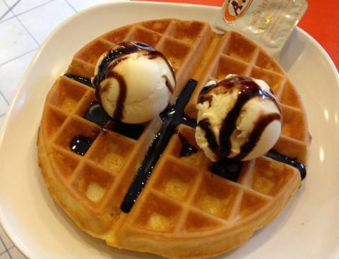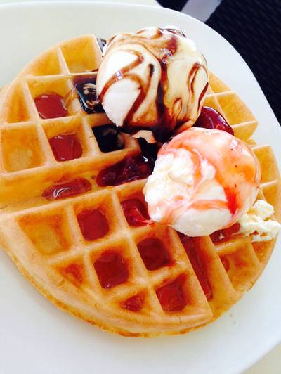 วาฟเฟิลทูโก แป้งวาฟเฟิลแน่นๆ แต่นุ่ม ใส่ไอศครีมวานิลลาสองลูก ราดด้วยซอสสตรอเบอรี่ ใครไม่ชอบสตรอเบอรี่เลือกเป็นช็อคโกแลต หรือน้ำผึ้งก็ได้