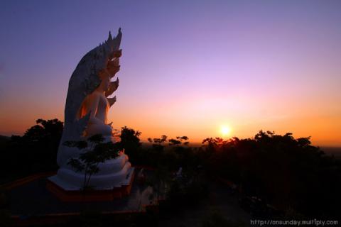 พระพุทธรูปปางนาคปรกเวลาเย็นพระอาทิตย์ ถ่ายออกมาสวยมาก